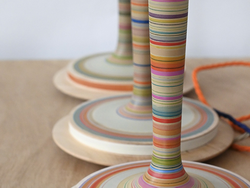 An elegant and colourful lime wood lamp with a cotton reel motif, turned and painted by hand on a traditional Jubilee Union lathe. Bright and also fine multi-coloured stripes, with areas of minimal fine lines breaking up other colourful areas, a bit like a repeat pattern. The base has broader and simpler bands of greys with yellow and red accents. This lamp will always hold interest as there are so many interesting juxtapositions of colours within it, great on a bedside table. Using artists’ quality acrylic paints and finished with a natural wax.